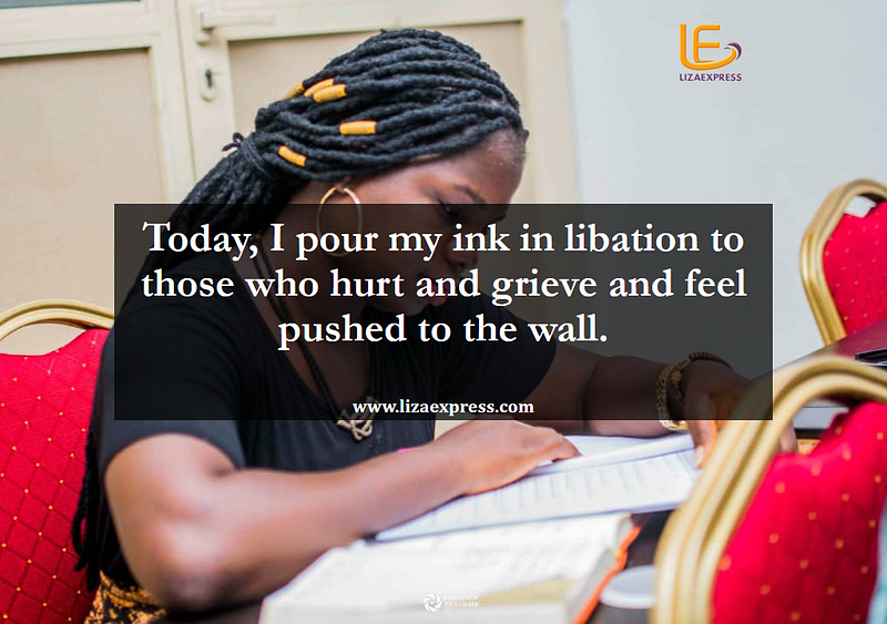 Today, I pour my ink in libation to those who hurt and grieve and feel pushed to the wall. I write songs of victory that stream as tears from eyes that look like fading sunshine. I write for those with heavy hearts like marble and those who bleed water from exhaustion in their hearts.